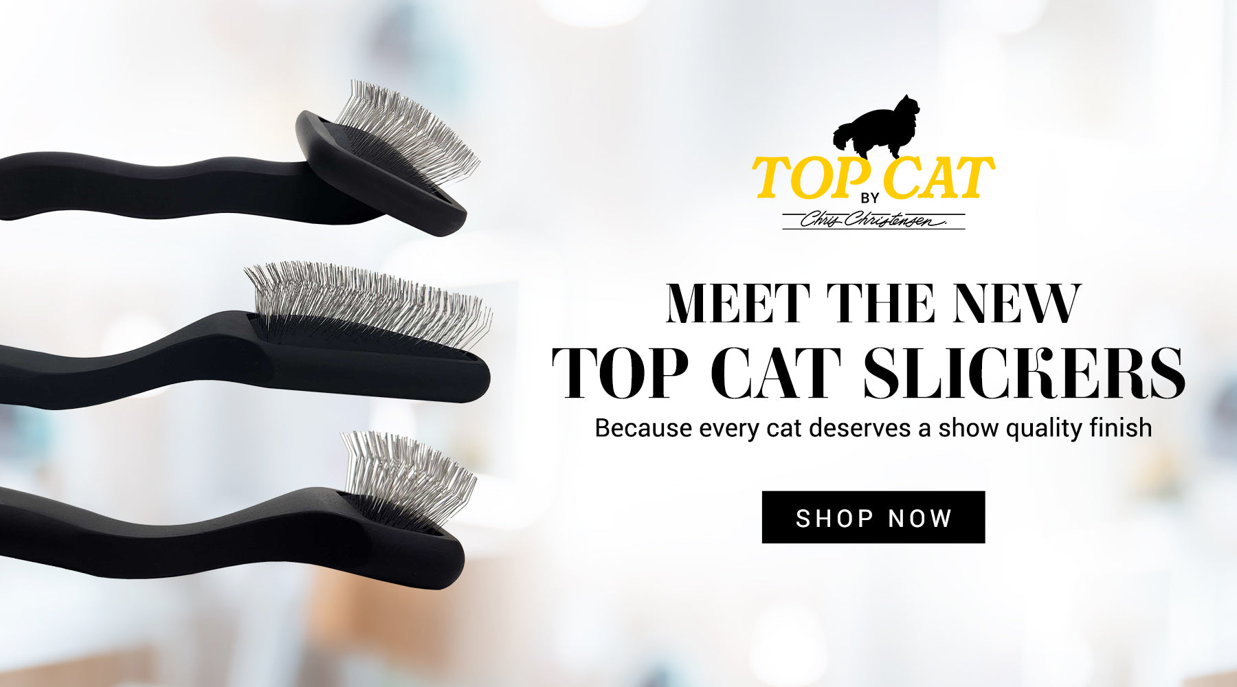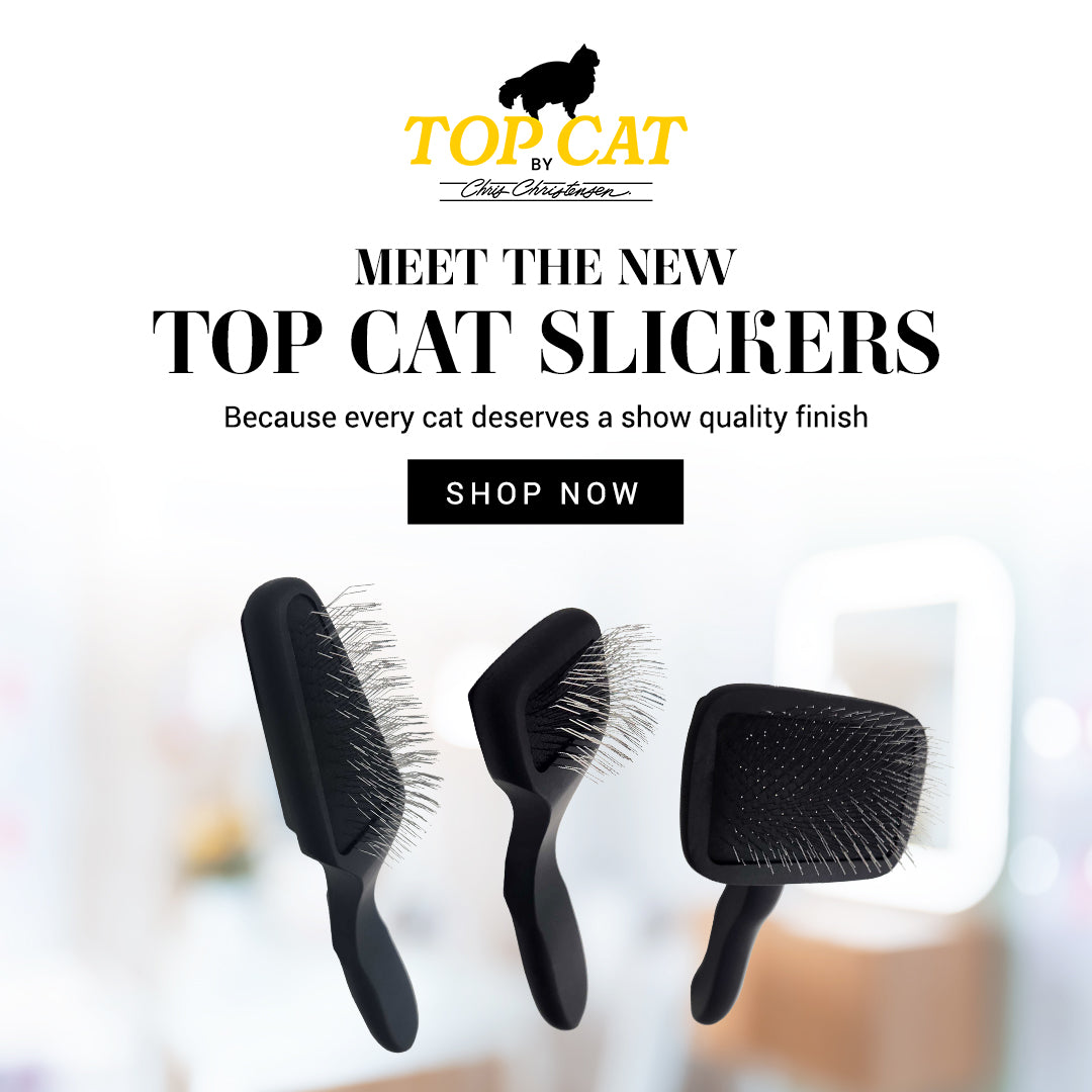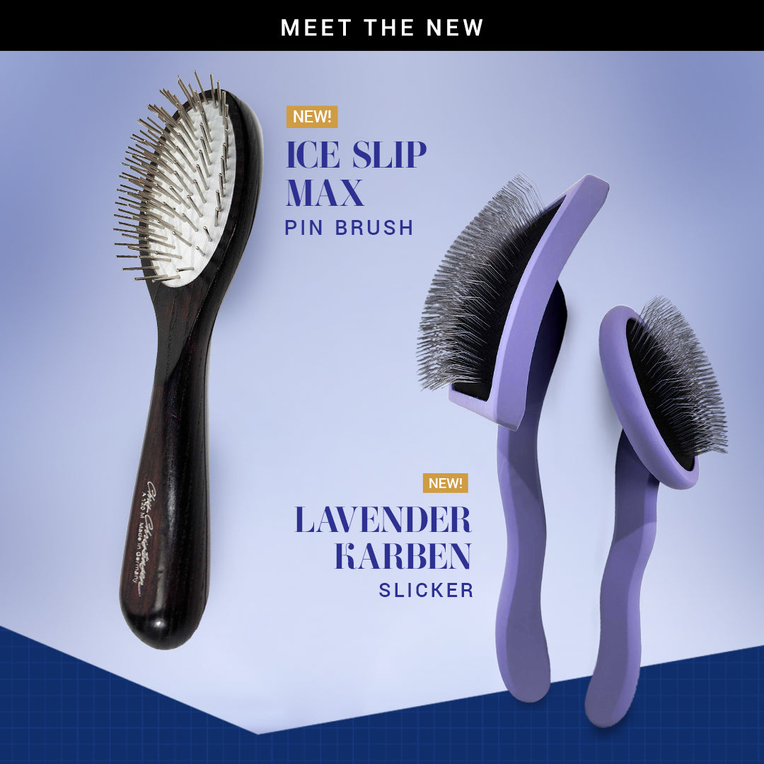 Two dog grooming brushes, one black and one purple, on a blue background with text indicating new product names.