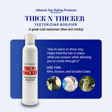 Chris Christensen Thick-N-Thicker immediately builds body, volume and lift! Adds texture and body to wire coats, fullness to coat furnishings and v...
